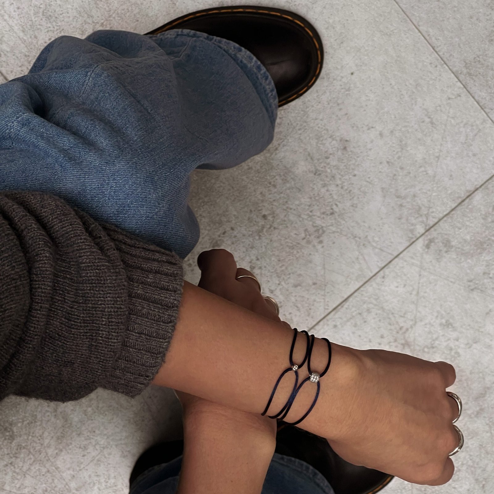Izsmalcināts rotājums, kas iemieso bezgalības un nemainīgas elegances simbolu. Delikātais tumši zilais diegs harmoniski aptver plaukstas locītavu, bet sudraba kulons ar dabisko dimantu mirdzumu kļūst par graciozu akcentu jūsu tēlam.